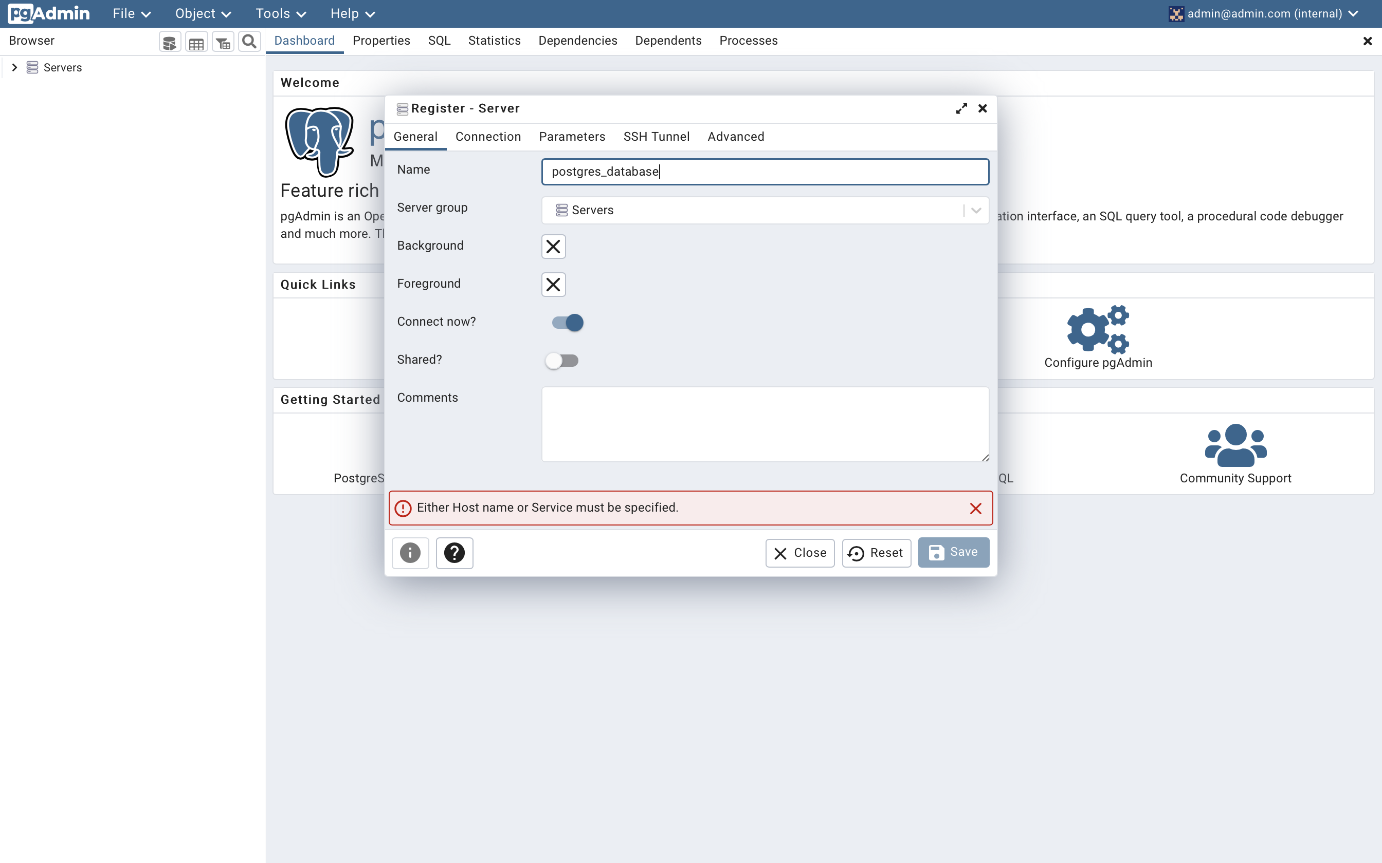 After starting the PostgreSQL and pgAdmin containers, it may take a few seconds for them to become available. Once they are up and running, we can verify that everything is working as expected by launching the pgAdmin UI in a web browser. To do this, we need to open localhost:5050 in our preferred web browser.