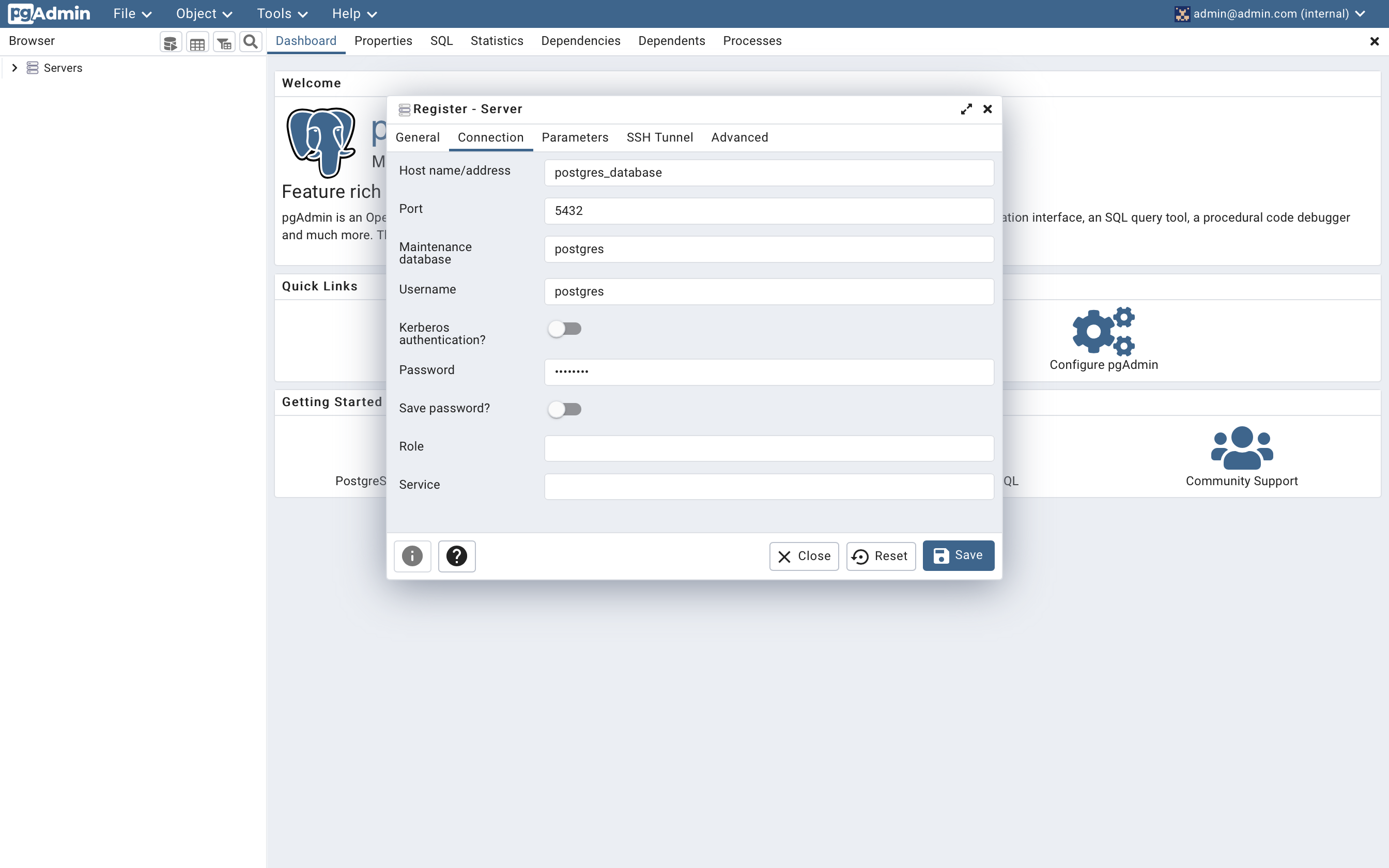 Setting up pgAdmin, an open-source administration and management tool for PostgreSQL databases that can be installed and configured alongside our Postgres container.